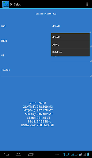 The app uses the ASTM tables (1980) and formulas to calculate weights and volumes based on entered density@15 or API, observed volume and temperature, and calculates the following: