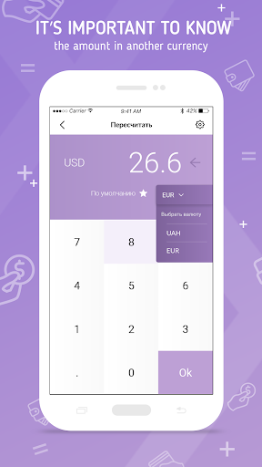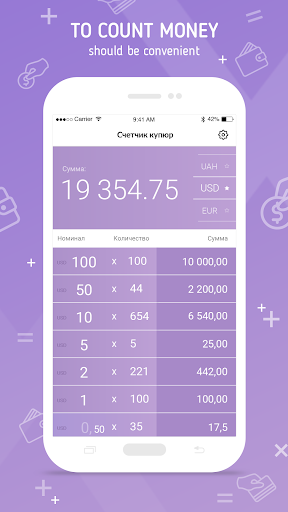 The application supports next currencies - USD, EUR, UAH, RUB, while it is possible to work with all currencies in the same time. Use convenient for you interface language - English, Ukrainian or Russian. Application settings will help to create an interface convenient for your use. Save a notes while counting your cash.