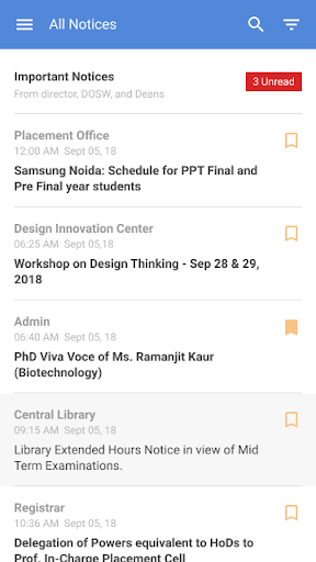- Filtering all the notices on the basis of categories and sub-categories, such as Departments(Sub-Categories: Electrical, Mechanical etc.), Authorities(Sub-Categories: Admin, Dean, Academics etc.), Placement Office