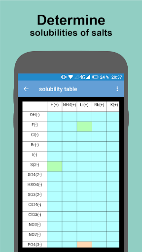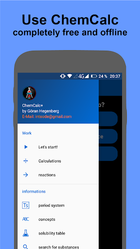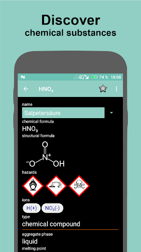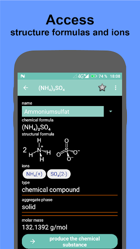 The app contains basic substance information such as melting point, boiling point, state of aggregate, molar mass and density. This information is stored in a database for a large number of chemical compounds and elements, so that the app can also be used offline.