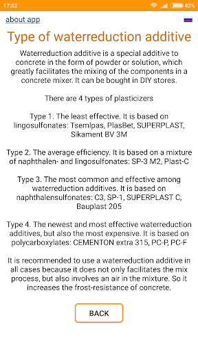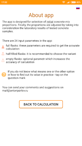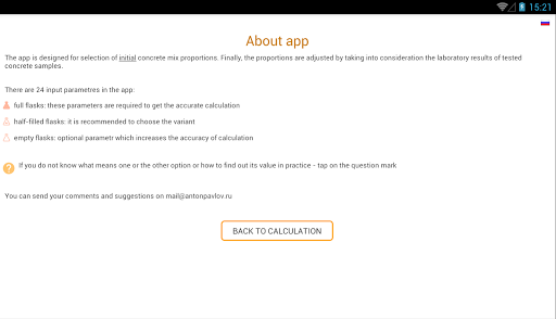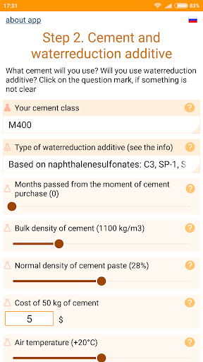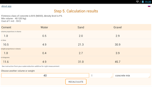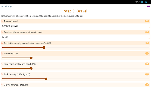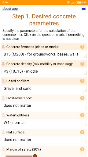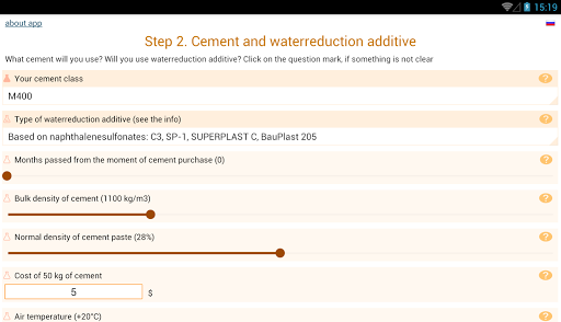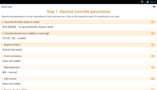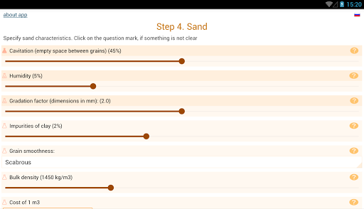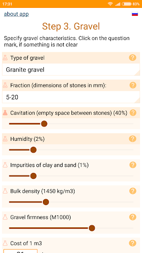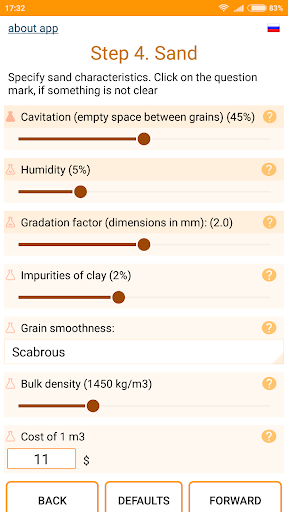 While using the app you will be asked to specify the characteristics of cement, sand and gravel. The basic values (cement mark, empty space between grains of gravel and sand) are necessary to specify - otherwise the calculation accuracy will not be high. But you can leave the default values for other features. The help is offered to specify each feature, which says how to find out or calculate the required value.