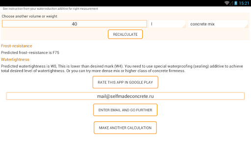 The application offers proportions of components for desired firmness with reliability of 95% and coefficient of variation of firmness of 13,5%. This means a large stock of safety. However, in order to be assured in terms of firmness, frost-resistance and watertightness, it is necessary to make concrete samples and test them in the laboratory. Thereafter, if necessary, adjust the proportions of the components. Application author does not give a 100% guarantee and is not responsible for difference between the actual characteristics of concrete designs and those, which were specified in the app. The application should be used for searching of initial proportions only.