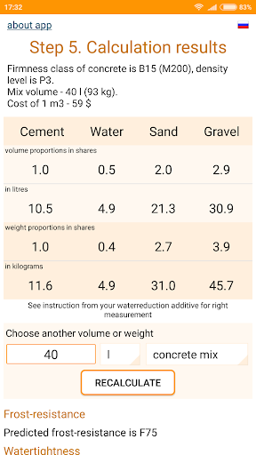 Finally, you will get proportions (eg, 1:0,5:1,5:3), liters and kilograms required to make desirable concrete. You can recalculate the liters and kilograms, for example, to bring them to choosen volume of concrete mix.