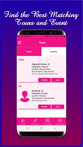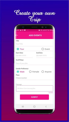 On my Events Create a Trip or Event with Attractive title and Preferred Gender and the Places you planning to Visit.