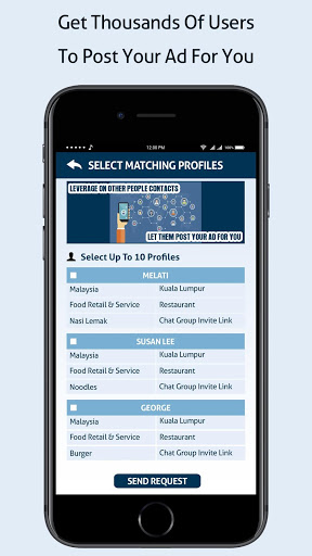 Unleash the power of mass marketing via WhatsApp, WeChat, Line or Viber at zero advertising cost. Leverage on other people contacts through our Match-Pooling Ad feature. We will match your advertisement target to matching users in the same business industry but selling different products. They will post your ad for you to their friends, family or customers through their group chat for Free!