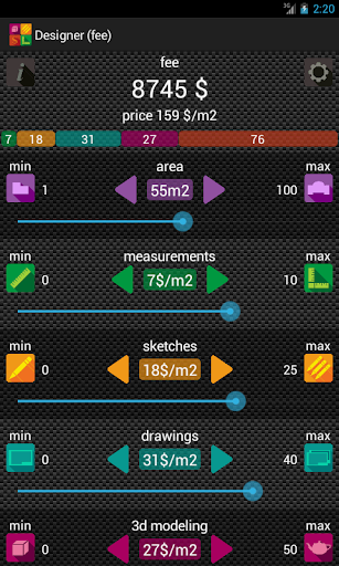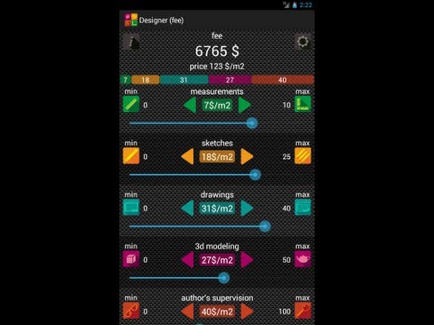 Fee calculator for the designer based on price measurements, drawings, 3d modeling, sketches, supervision.