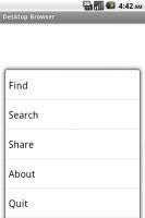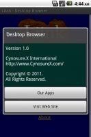 Desktop Browser allows your capable Android tablet and Android phone to render web sites in native desktop view. Instead of seeing mobile versions of web sites, you can quickly and easily view web pages rendered just like you can on your computer. No more limited function mobile sites if your Android device can handle it. It's a great solution for large screen tablets where a full-featured web page can be fully rendered to take advantage of the screen resolution and estate. You can now have fun accessing web sites built for desktop and notebook computers. Save time looking for functions that doesn't exist on mobile web sites. For example, if you try to view FoxFi's web site with Android Browser, the web site will redirect you to Google Play (Android Market) for you to download the FoxFi app. But if you really want to get the latest information on FoxFi's web pages, you'll have to use Desktop Browser to see them. Desktop Browser has the ability to emulate various different browsers via user agent strings: 1) Apple Safari 4; 2) Desktop Browser; 3) Mozilla Firefox 5 for Windows; 4) Google Chrome for Macintosh; 5) Google Chrome for Windows; 6) Microsoft Internet Explorer 8; 7) Opera 9 for Macintosh. Pick the one that is best for the web site you want. Switch between browser user agent strings at will. Emulation defaults to "Desktop Browser" on install; be sure to change the emulation via menu operation. Download Desktop Browser right away to use alongside the Android Browser. You'll love the proven results. Menu Options: Emulate - Allows you to choose from various browser's user agent strings, which the Desktop Browser will pretend to be. New URL - Allows you to enter a new web site link. The dialog box remembers the last URL you entered. Edit URL - Use this option to view the URL of the current page. You can then modify the URL, or copy-and-paste it into a bookmark or into a different app. Bookmarks - Access the Liink (www.Liink.com) online bookmark site. You can access your bookmarks on Liink from any browser on any computing platform. Save Page - Saves the current web page to your SD Card (in the /sdcard/download/ directory). Refresh - Reloads the current web page. Search - Provides a Google search box to help you search the web. Find - Lets you find text passages on the current web page. Select Text - Select text to copy to clipboard. Copied text can be pasted into other Android apps. This menu option is available on Android 2.3 and prior. On Android 4.1, long tap on a word to select and copy text. Page Info - Displays information regarding the current web page. Share - Share the current web page with family and friends. About - Brings up the About dialog which shows you information about this app, such as the version number. Quit - Shuts down the app completely.