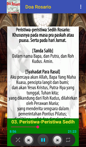 রোজারিও প্রার্থনা অ্যাপ্লিকেশনের রোজারিও নামাজের সমস্ত ইভেন্ট রোজারিও সম্পূর্ণ করুন। মানের অফলাইন অডিওতে পরিবেশিত এবং পাঠ্য (ট্রান্সক্রিপ্ট) দিয়ে সজ্জিত যাতে এটি বোঝা এবং অনুশীলন করা সহজ। রোসারিও কীভাবে প্রার্থনা করবেন তা সম্পূর্ণ পদক্ষেপগুলি সহজেই উপস্থাপন করা যায় যাতে এটি শিখতে সহজ হয়। আপনি একটি অ্যান্ড্রয়েড গ্যাজেট আছে যতক্ষণ না এবং কোথাও যে কোন জায়গায় অ্যাক্সেস করা যেতে পারে। এটি রোজারিও প্রার্থনা প্রয়োগ করে তোলে যারা রোজারিওকে প্রার্থনা করতে শিখতে চায় তাদের জন্য সঠিক পছন্দ।