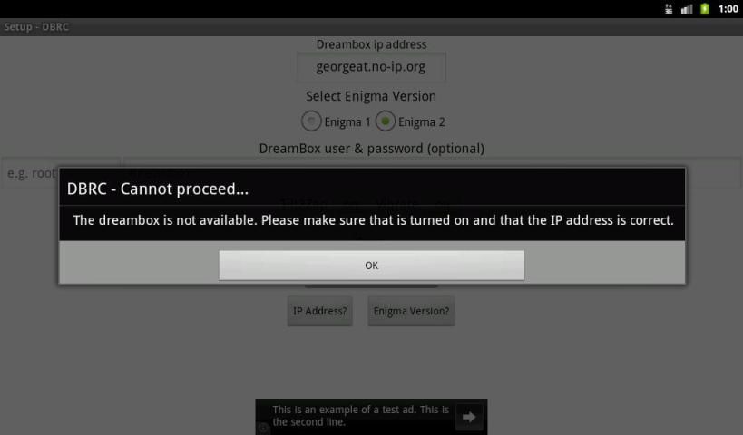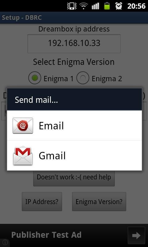 In case of an error please use the “Doesn’t work / Need help” button located on the setup screen. An email will be sent to us with the phone model, android version and dreambox model.