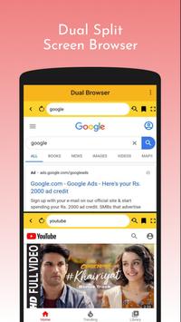 Dual Browser for exploring your internet surfing into two separate windows on one screen.This app is usually used for the multitasking like you can search two different queries at a same time and on a same screen of browser.