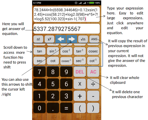 This scientific calculator is made to make editing of large expressions easy. I have faced situation in my engineering where I have to write large expressions with little changes again and again. So I made this scientific calculator where you can easily edit and write large expressions. One more great feature of this scientific calculator is that you can deal with large numbers i.e. you can even calculate Factorial of 5000. One more thing you don't need to press shift this will save lot of time.