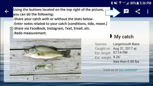• Immediately share a picture of your catch that includes stats (weight, length, day, time) with friends and family by uploading it to social media or sharing it via text message or email