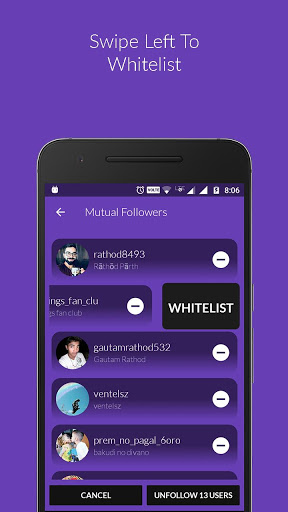 - Add your favourite users to whitelist by swiping them to left and they won't be shown in your Non Followers & Ghost Followers list.