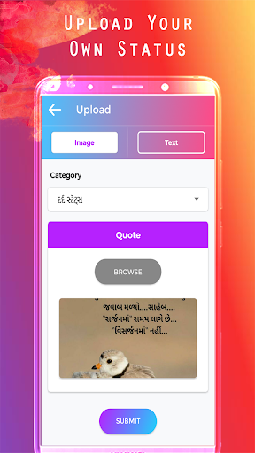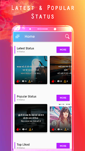 Gujarati Status is the best app for all of those who are extremely waiting for something new status collection which they can share and save in their gallery.Square Image of any status with numerous categories.You can login with security and upload your own quote by selecting category.This helps in express your feeling towards our application.
