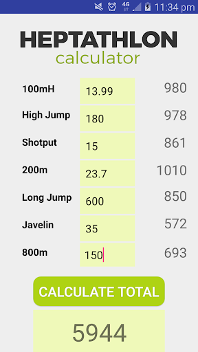 Calculate scores for the Women's Heptathlon 100mH High Jump Shot Put 200m Long Jump Javelin 800m And then calculates the total.