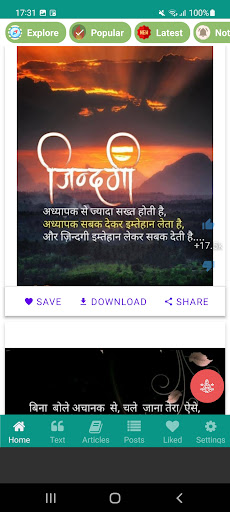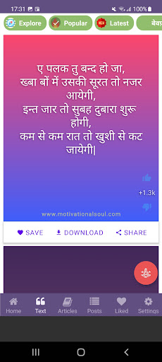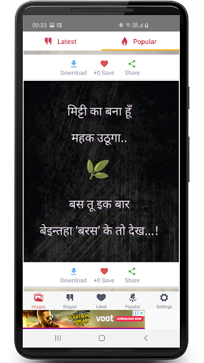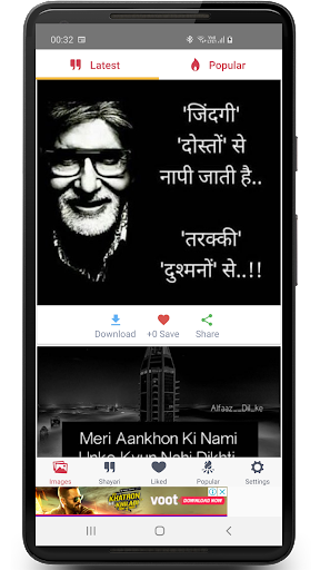 The largest collection of Hindi Shayari and Quotes. Express your mood with all types of Shayari, poems and status quotes. Download images to your phone. Share or set status with just one click, it’s too easy. Find the perfect Shayari to share with your loved ones, through social networking or instant messenger apps. Express yourself with both words and pictures! Very user-friendly and simple. Birthdays or festivals, find appropriate Shayari for all occasions. Thousands of heart rendering, touching quotes and Shayari thoughtfully compiled in many accessible categories.