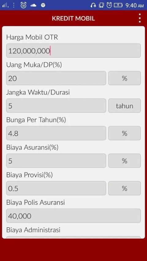 Hitung kredit mobil adalah aplikasi yang digunakan untuk memperkirakan berapa yang harus dibayarkan jika ingin mengambil kredit mobil. Bagi anda yang akan mengajukan kredit mobil, silahkan gunakan kalkulator ini untuk mengetahui besarnya bunga dan simulasi daftar angsuran.