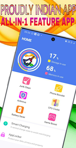 INDIAN CLEANER ANTIVIRUS = Junk Cleaner Antivirus Phone Booster Applock CPU Cooler Battery Saver Duplicate File Remover Notification Manager Game Booster Smart Charging App Manager
