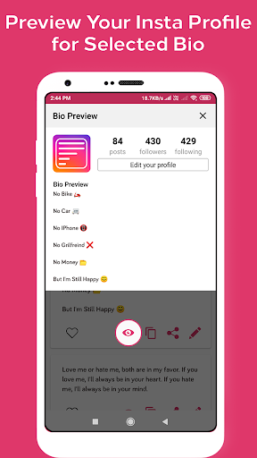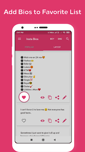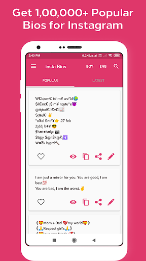 Insta Bio & Quotes for Instagram app contains awesome quotes with different emojis to make your profile look more attractive & Royal. We do not offer bios that are only single or two lines quotes But you will find bios that will actually give a complete intro of your personality.