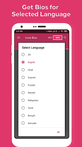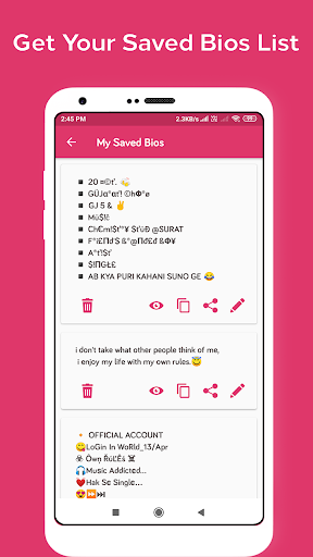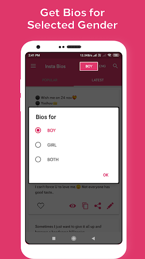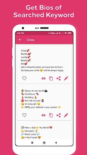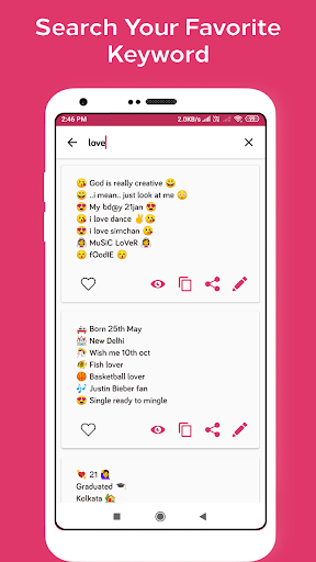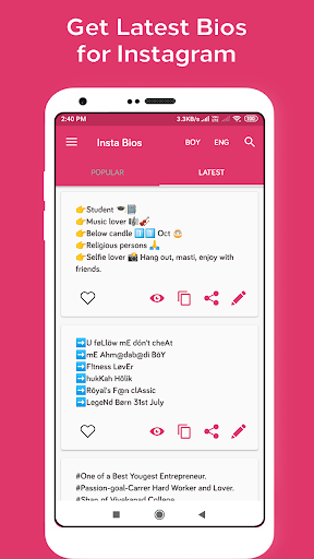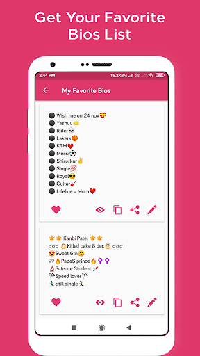 App contains too many functionalities like Copy Bios, Edit & Save Bios in your list, get Bios with Multiple Languages, Filter by Gender, Preview Your Profile with selected Bios,Search Bios, Popular & Latest Bios, Add to Favorite Bios, Share in Social Media, etc..