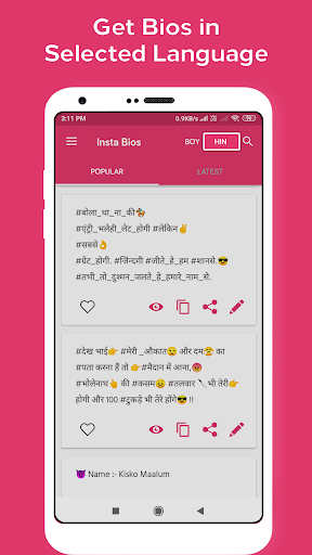 1) Popular & Latest Bios: App having 1,00,000+ Trending, Popular & Latest unique Bios with Emojis.