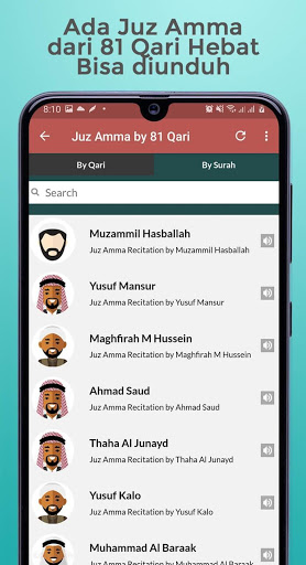 - เสียง Murottal จาก 7 Qari ที่มีชื่อเสียงเช่น: Abu Bakr al-Shatri, Abdullah Basfar, Sa`ud Ash-Shuraym, Mishari Rashid Al-`AFasy, Muhammad Siddiq al-Minshawi, Abdur-Rahman เป็น -Sudai, Saad Al Ghamdi ที่คุณสามารถฟังได้อย่างง่ายดาย