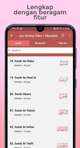 - คุณสมบัติการค้นหา Surah ที่ทำให้ง่ายสำหรับคุณในการค้นหาจดหมายที่ค้นหาได้ - คำแนะนำที่สมบูรณ์แบบเพื่อใช้แอปพลิเคชั่นออฟไลน์ JUZ AMMA Offline