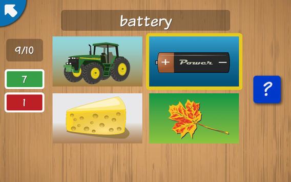 2) Reading quiz to learn to read English words, 4 pictures and 1 word are shown. Select the right image for the word.
