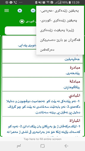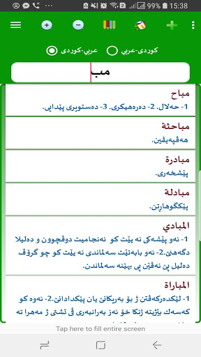 التطبيق عبارة عن أداة بحث للكلمات عن اللغتين العربية والكردية الكرمانجية اللهجة البهدينية في شريط البحث أعلى التطبيق .