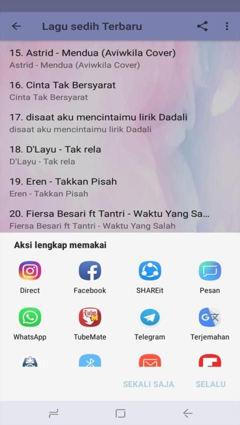 - kenangan terindah,pernah azmi,kusimpan rindu di hati,tinggal kenangan,kesedihanku. Dan beberapa lagu galau yang cocok untuk nostalgia dari seperti : tak seindah cinta yang semestinya,masih mencintainya,lagu galau pupus,tentang rindu,berhenti berharap dan masih banyak lagu menarik lainnya. Berbagi kelebihan juga kami berikan untuk anda semua seperti berbagi lagu biar aku yang pergi, jadikan nada dering (nada kontak,nada alarm,nada pemberitahuan).