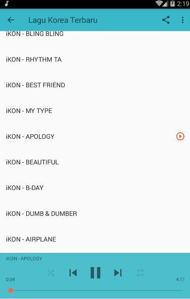 Aplikasi ini berisikan lagu korea terbaru lengkap enak didengar. Selain itu juga aplikasi ini sangat ringan sehingga tidak menguras kuota internet Anda, lagu ini bisa Anda dengarkan kapanpun dan di mana saja.
