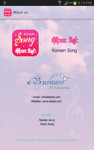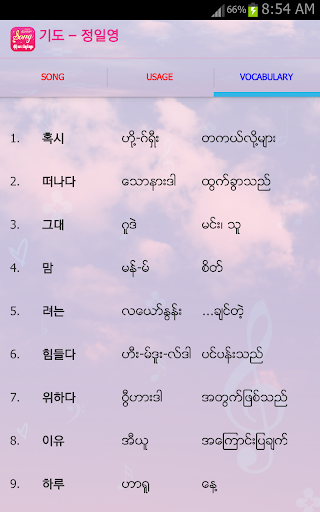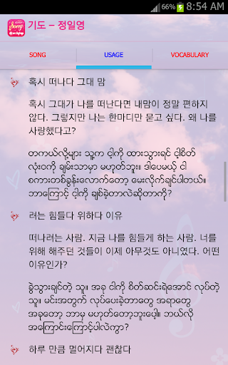 For those Myanmar people who want to learn Korean language by its songs. App include song translations in Burmese, usage and vocabulary.