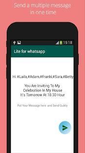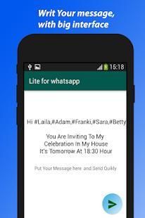 How many time you want to send the same message to 10 or 12 from your friends or familly,to inviting to a celebrate,or a dinner,or a picnic ,but you still daoubt how can you do that,now with lite for whatsapp you can write your message conversation in a big interface,and send quikly,from whatsapp directly.