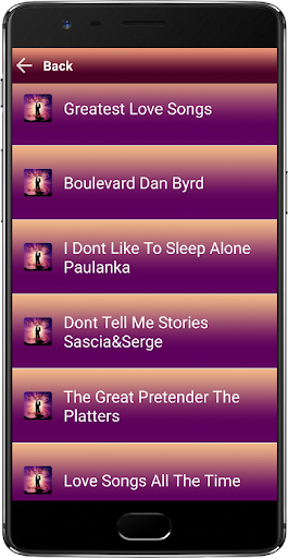 Songs App for Mp3 Love Songs with music and Playlist, Love Songs Sweet Memories, Top Hits music and User Friendly to use. In this application you will find a large collection of artist albums and your favorite songs.