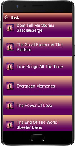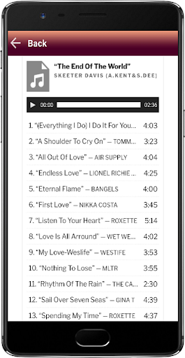 We proudly present a Playlist app for Music Love Song fans. This application presents a collection of the best songs of 1980 1990 which are the most popular of all time. Love Songs MP3 is a streaming mp3 player application that is very easy and simple to use.