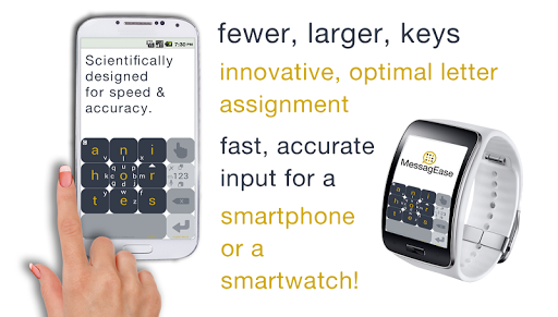 MessagEase is the world's most innovative touch screen keyboard, revolutionizing text entry on mobile devices. It's the smartest keyboard for smartwatches, smartphones and tablets where the QWERTY keyboard is impractical or very inefficient. MessagEase is the ideal keyboard for Google Glass or any other wearable device.