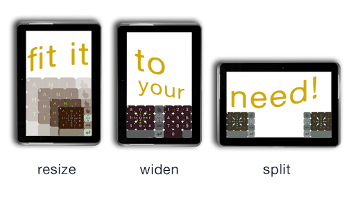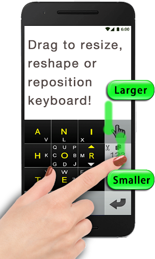 Please also note that you can change the keyboard size by dragging up/down on the Hand button. You can also reshape and recolor the keyboard in various ways. See Settings for details. You can also change the font used for the keyboard; you can even re-assign new characters or hide and remove some of the characters: yes, it is customizable like no other keyboard you've ever seen.