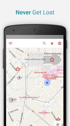 The Milan Offline Map and the Milan City Guide content are fully downloaded and stored on your device. All features, such as address searches and your GPS location also work offline and without data roaming (an internet connection is of course required for initial downloading of data or booking hotels).