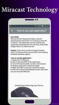 Miracast Screen Sharing Display/Miracast Smart TV Cast Display App will provide an option to share Android phones screen on to smart TV or Wireless Display devices or Mircast enabled dongles.