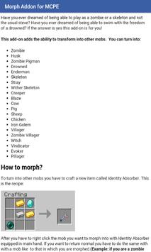 Find a mob in-game and use the Morph item to tap on it and you will morph into that mob. It doesn’t work for all mobs but for most ones it actually does.To return to your original skin you have to re-enter the world
