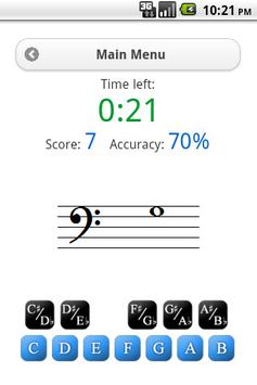A perfect tool for people learning music. Practice your sight reading skills by using this application. Choose to practice between treble, bass or both kind of notes for a duration of 1, 5 or 10 minutes. Try to make a higher score each time. After each test, you can review your mistakes.