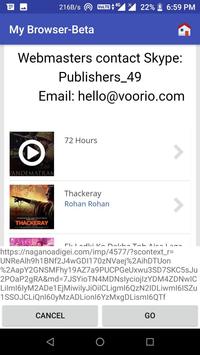 This browser is developed for fast surfing,lite mode. Every URL will be shown before user to load so user can identify and block ad pages. Mainly in download site many ads are opening at a time without user interaction and on scroll event and user can't understand issue. So this will ask every time before going to any url. Hence this will ask for Proceed of cancel loading particular url.