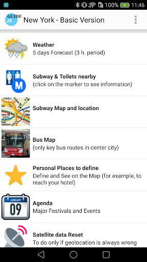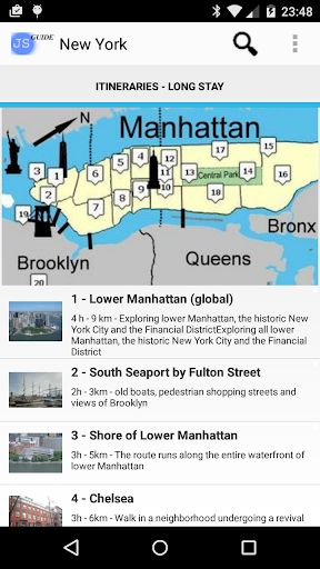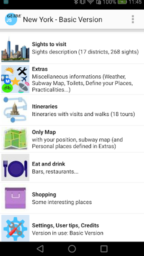 Guide of the city of New York, with an included self-oriented online or optional offline map and other tourist maps like WTC Memorial, Rockfeller Center, Columbia, Lincoln Center... The guide uses GPS location and compass to orient the map correctly. It offers 18 itineraries, describe 260 sights, and some practical aspects. It's a real tour guide to visit the city by yourself, with a focus on US history. You find many features, as exclusive maps or highlights for practical POIs (see screenshots). Texts are written only for this guide, with an historical perspective. There is no ads.