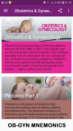 Obstetrics And Gynaecology App. This application provides Mnemonics that will help both physicians and medical students to remember the knowledge of Obstetrics & Gynecology Mnemonics the information that the application has are well precise and simple straight forward for easy practice.