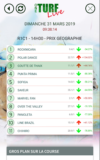 Con OneTurf Live, puoi seguire tutte le gare della giornata con i dettagli necessari per una buona analisi. Dal momento della partenza al risultato di una gara, sei costantemente informato delle valutazioni dei cavalli, con la valutazione della tendenza in base alle questioni.
