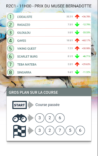 Per ogni gara, hai accesso a una prognosi esperta di 3 cavalli, elaborato dal nostro team; Questa prognosi si sta evolvendo e cambia in base a fattori dinamici, come il tempo del momento, il valore e la distribuzione della posta in gioco, e le indicazioni dell'ultimo minuto dei nostri corrispondenti (rumori stabili, forme di cavalli, forme dei diversi attori e ADS realizzati dai partecipanti). Per ogni gara, sei informato sul risultato ufficiale all'arrivo.