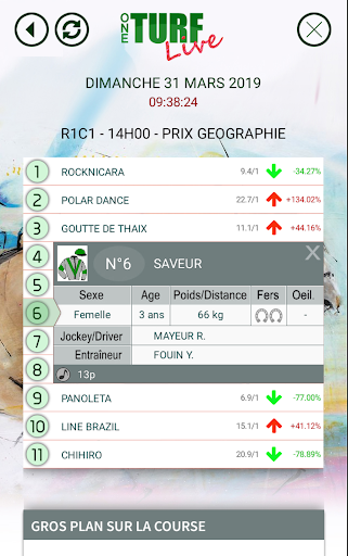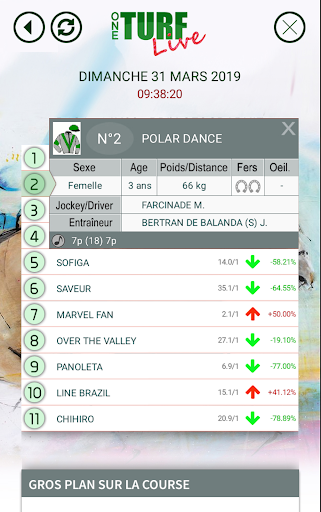 Per ogni cavallo, tutte le razze e le riunioni combinate, conosci l'identità del suo jockey o del suo autista, il suo allenatore, le sue spettacoli passati, la sua età, il suo genere, il suo peso o la sua distanza, lo stato dei ferri e la presenza di paraocchi.