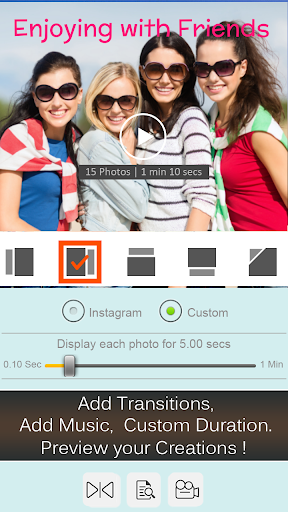 ➜ Custom option of making music slide show till the end of audio or predefined size for instagram. For eg. the music you have selected is of 5 minutes duration, and you want to create a slideshow movie of 5 minutes till the end of song - you can easily do so by custom settings. You can also use this for creating presentations for your office.