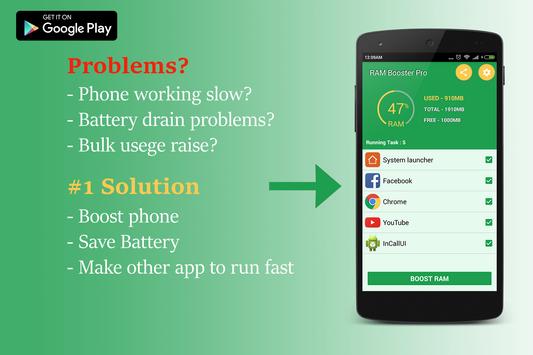 RAM Booster Pro provides you the best solution for above problems. RAM Booster pro is just removing bulk usage of your RAM and make your phone faster. It will help your other apps and games to run faster and not being laggy. It will also save your battery usage with hibernate running apps to save power.