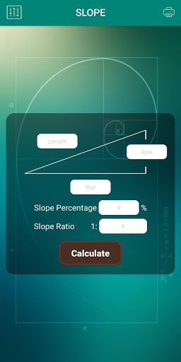 With any two inputs, this App will calculate all ramp's information accurately. - Slope (incline). - Run (horizontal travel). - Ramp Length. - Rise (Height). - Slope Percentage & Ratio.